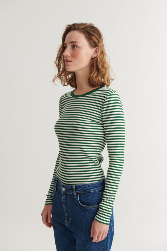 Basic Apparel - Ludmilla SS Stripe Granddad T-Shirt Abundant green / whisper white