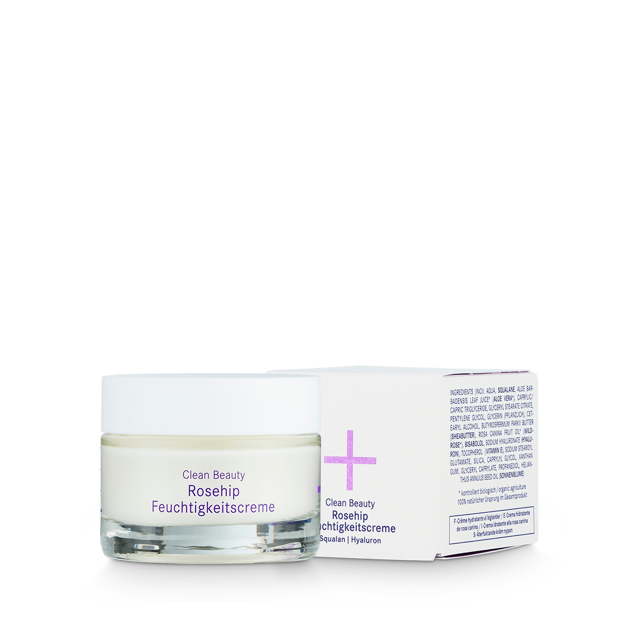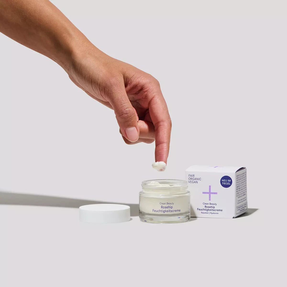 Die Clean Beauty Rosehip Feuchtigkeitscreme schenkt samtig glatte Haut. Dank einer milden Rezeptur mit reichhaltigem Hagebuttenkernöl versorgt sie vor allem trockene Gesichtspartien intensiv mit Feuchtigkeit. Gleichzeitig ist ihre besonders klare und reizarme Formulierung reduziert auf ausgesuchte Inhaltsstoffe in Bio-Qualität – hautverträglich und vegan.