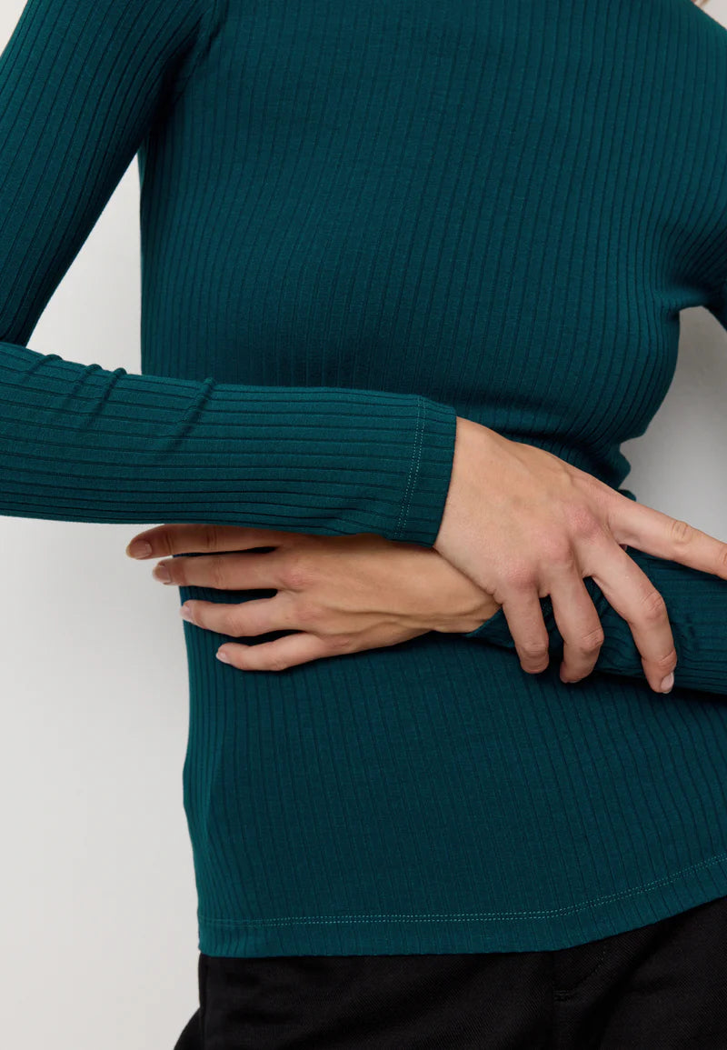 Das Longsleeve besteht aus weichem, formstabilem Jersey und zeigt eine schlichte, leicht taillierte Silhouette. Der Rundhalsausschnitt und die feine Struktur verleihen dem Design eine klare, zeitlose Note. Ideal für Lagenlooks oder solo getragen.